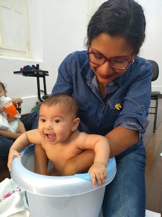 Foi por isso que eu fui conhecer a técnica da shantala, uma massagem para bebês que pode ser feitas pelos pais, pelos avós, pelos cuidadores, pelas tias das creches e pelas enfermeiras dos hospitais. A prática ajuda a estabelecer um vínculo afetuoso, acalmando o bebê, melhorando seu sono, entre outros benefícios.