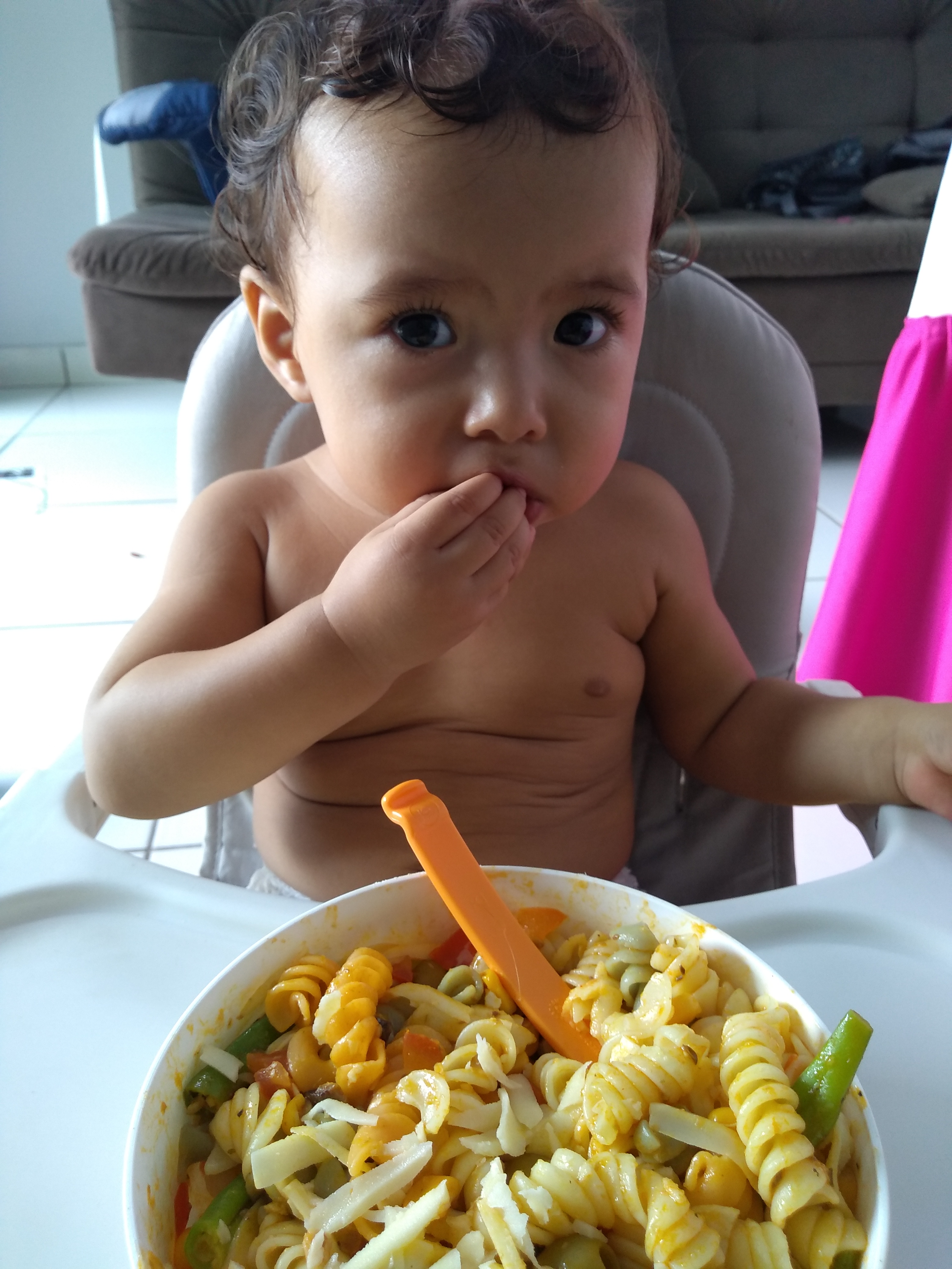 No almoço, fiz um prato especial com os ingredientes favoritos da Laura: macarrão com molho de sardinha, legumes e queijo. Ela se esbaldou. Depois de encher a barriguinha, tomamos banho, fomos deitar, mamar e acabamos pegando no sono.