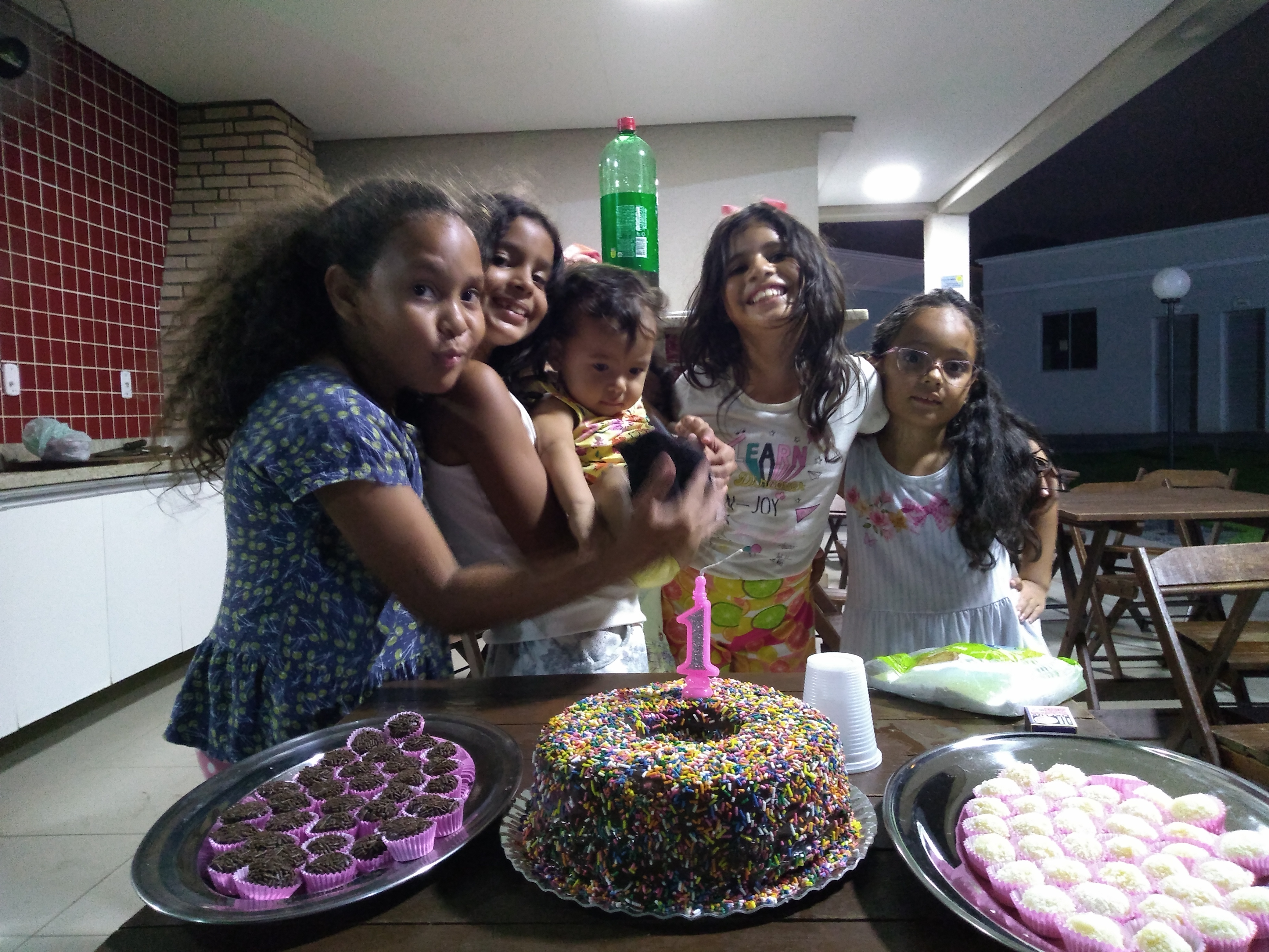 Ela abraçou o cachorro, a gata, ficou no portão olhando o movimento da rua… No final do dia, para não passar em branco, levamos um bolo, docinhos, pipoca e refrigerante no condomínio onde morávamos para comemorar com as amiguinhas. Elas adoraram rever a Laura e todas se divertiram muito!