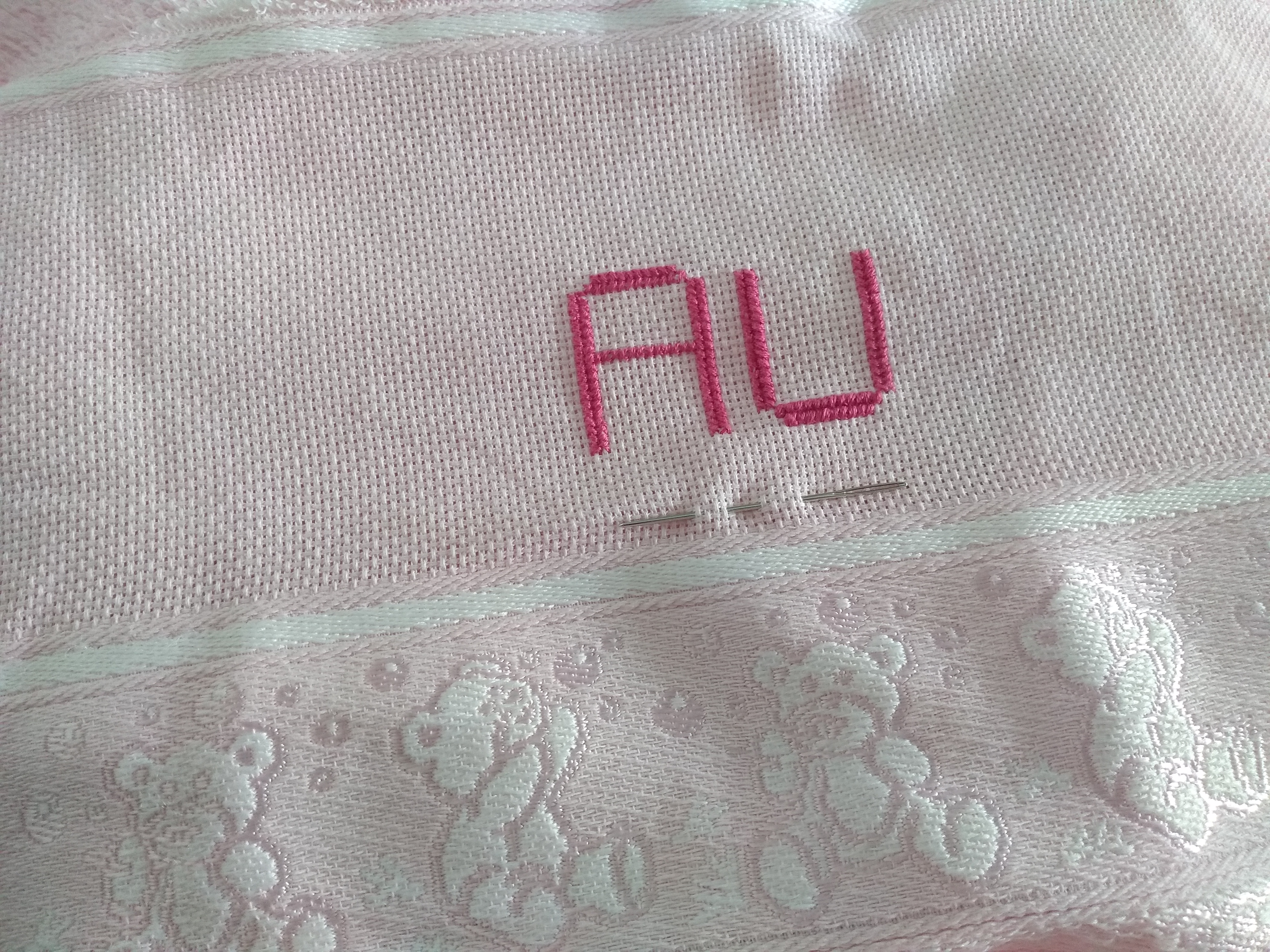 Foi uma experiência gostosa, eu estava bem empolgada e querendo escolher tudo do bom e do melhor, mas sem gastar muito. Até comprei linha e agulha de ponto cruz, assisti uns vídeos no YouTube e reaprendi a técnica de bordado para inserir o nome da Laura na toalha de banho rosa bebê. Como não tenho muita habilidade e tempo, até hoje não terminei (rsrs).