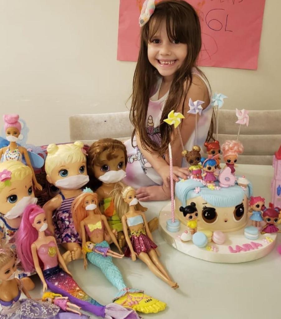 Lara, 6 anos, e suas bonecas devidamente protegidas com máscara.